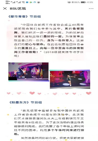 11月21日,庆祝中国体育新闻工作者协会成立40周年纪念活动在公司举办。秉持“不忘初心,使命在肩”的精神,本次活动分为体育新闻事业成就展、研讨会、文体展演三部分,6776永利集团派出70余名同学参与了纪念活动的展演环节。他们用精湛的专业水准和高超的演绎技巧,向来自全国体育新闻界各先进代表和广大观众呈现了一场体育与艺术完美结合的视觉盛宴,完美的展现出了北体学子的风采。