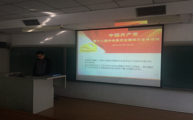 首先,由员工干部田昊同学以PPT的形式,为大家简单阐述了此次活动的主要目的及流程,并要求在场所有同学做好笔记,认真学习。随后,播放十八届四中全会的视频,学习了关于习总书记全面推进依法治国、深化改革的方针政策,学习党的十八届四中全会精神以及今后一个时期全党全国的重大政治任务等方面的内容。最后,大家针对此次活动展开讨论,每位同学都发表了自己的看法,对当前我们国家的国情、国家任务建设等方面有了更深一步的了解。