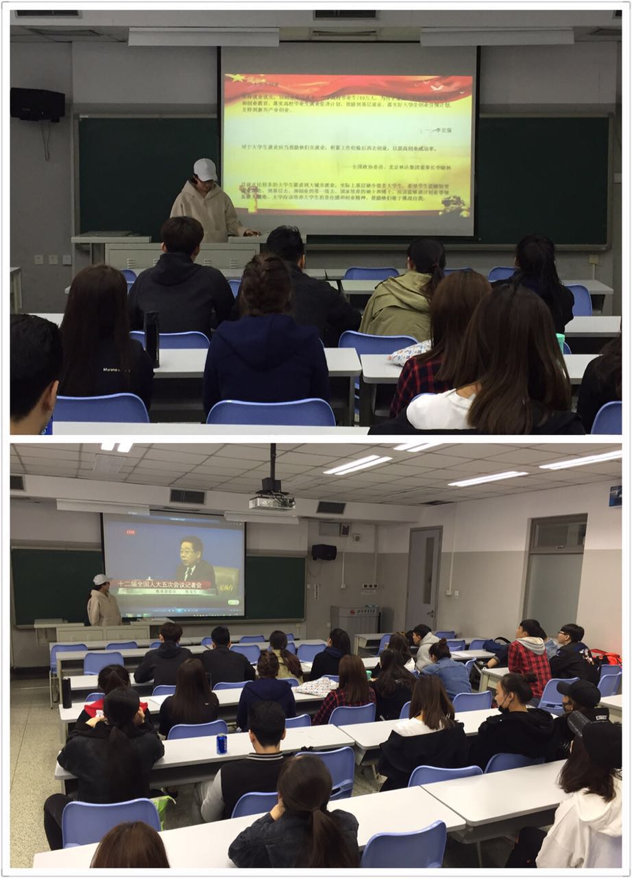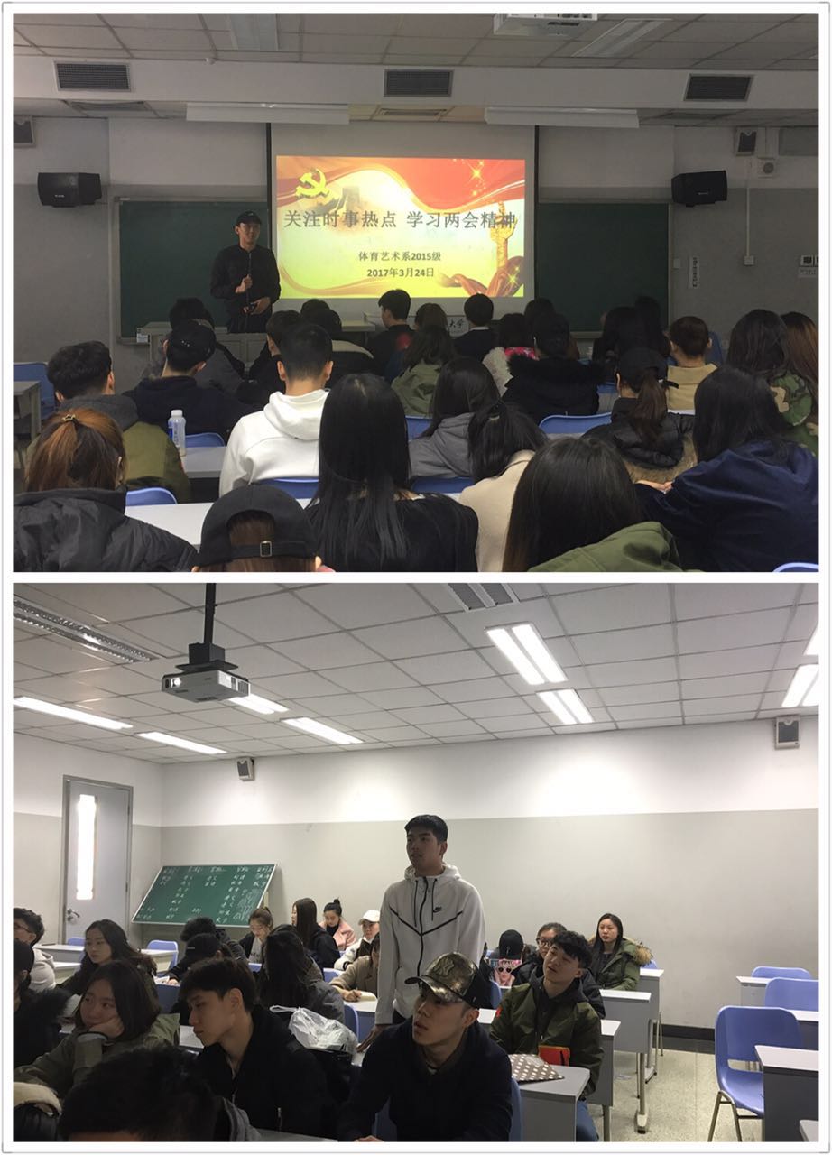 为了更好的学习和贯彻“两会”精神,增强老员工的思想政治理论素养,体育艺术系2015级全体同学于3月29日上午10点,利用形势政策课时间在教学楼401、402、403教室开展了“关注时事热点学习两会精神”的主题班会。